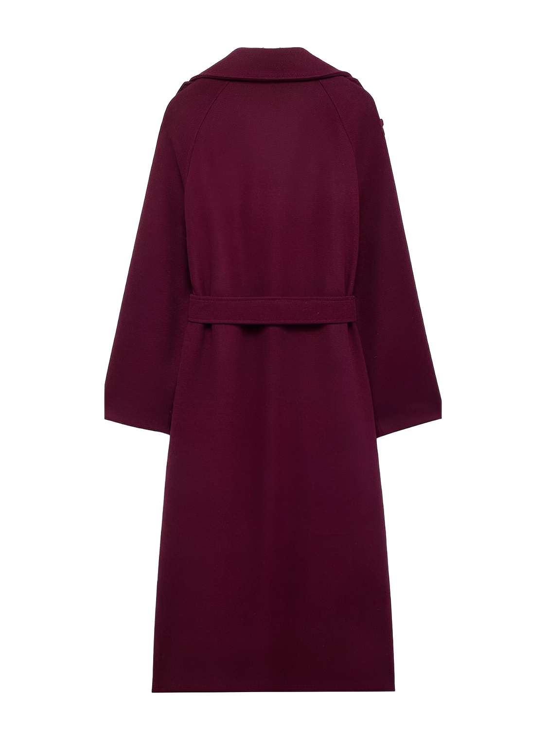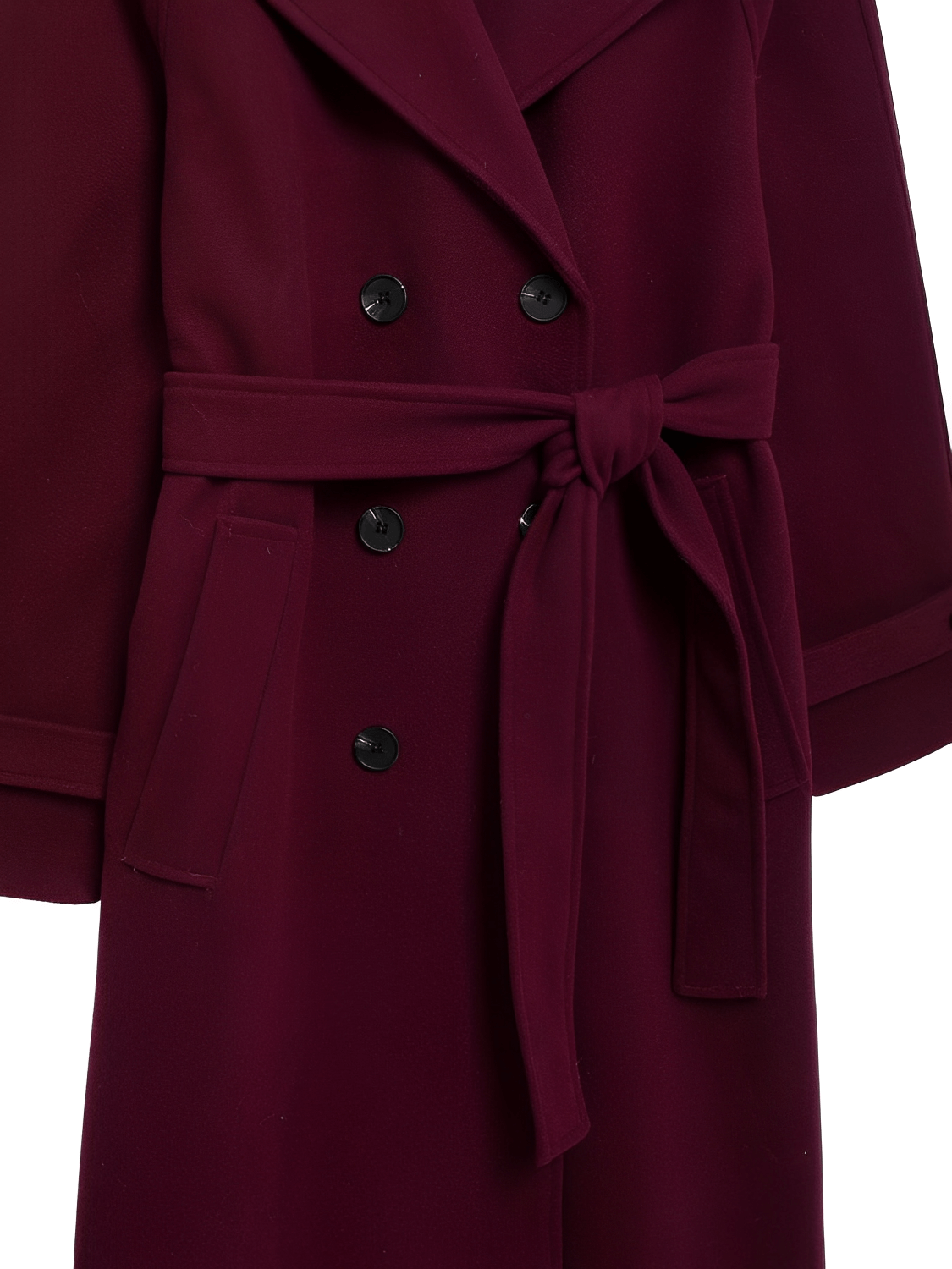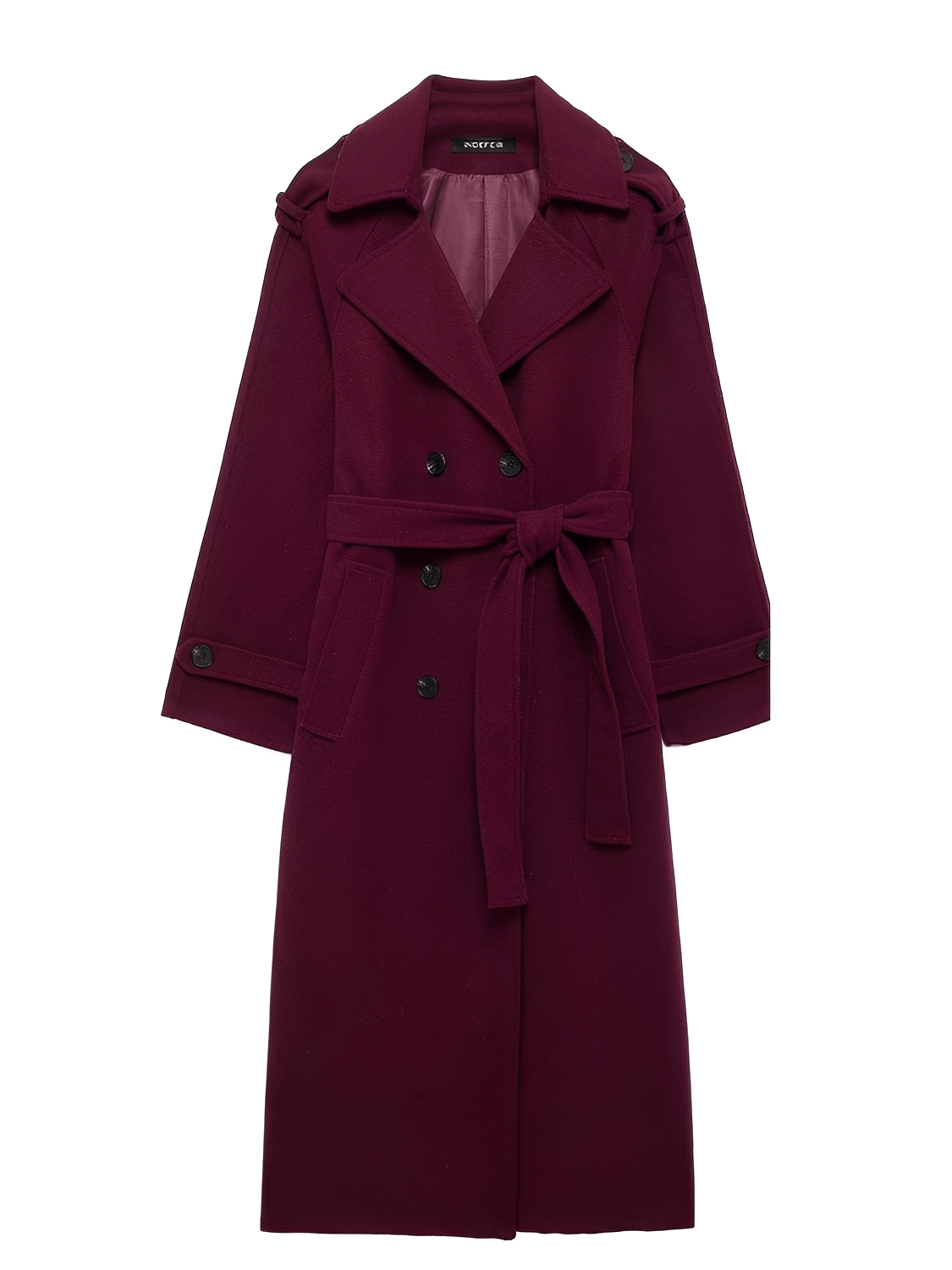 Diferenciadores competitivos: tejido encorpado de lana batida que ofrece textura y aislamiento, detalles de sastrería contemporánea (solapas en hombros y botones decorativos), y una faixa para amarrar que añade versatilidad de estilizado —todo en una pieza larga y estructurada pensada para la mujer moderna.