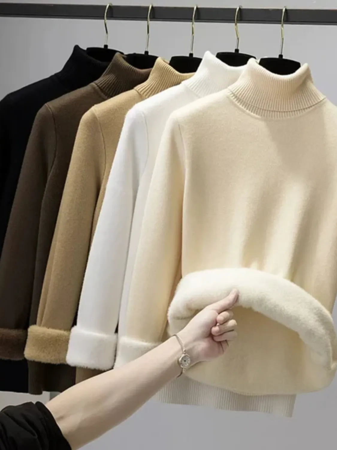 - Detalles: Cuello alto canelado, interior peluciado, mangas largas.